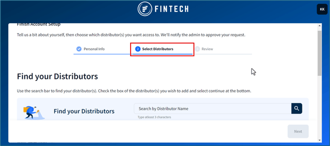 When registering for E-Vite, you will need to associate the company you work for to your account under the Select Distributors step: