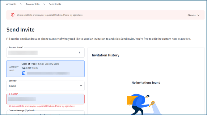You may receive a pop-up notifying you that E-Vite is unable to send your invitation to the chosen retailer when using the Accounts page. Message us for help via Settings > Contact Us. Learn more here: How can I contact Fintech for Help?