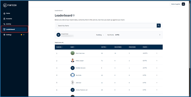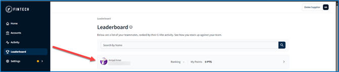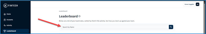 The Leaderboard screen provides a little friendly competition by showing a list of your teammates ranked by their E-Vite activity. You can see how you stack up against the team based on the number of retailer accounts registered in E-Vite per user, and if those accounts actively use Fintech to pay their invoices. Administrators are able to click on a row within the table for a more detailed view of the user's activity.