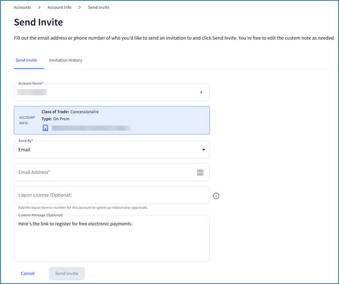 - The invitation form will appear with the Account Name and Account Info prefilled: