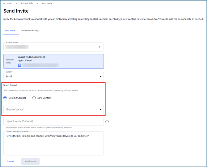 💡 If a retailer has an active Fintech account but has not received a relationship request from you, you'll be able to email their E-Vite to an existing user or a new contact. However, you will only be able to text the E-Vite to a new contact: