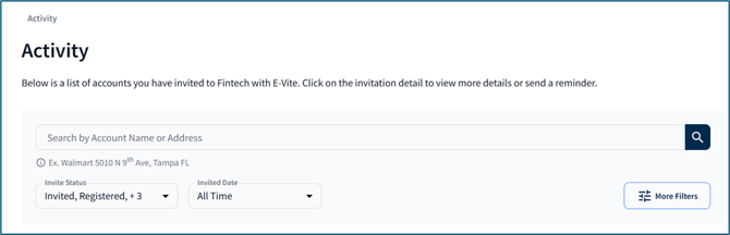 The Activity tab shows a list of accounts you've invited to use Fintech through E-Vite. The total can be seen above the table in Total Accounts.