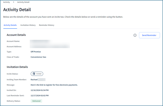 Click on an account in the table to view its Activity Detail. Here, you can view account details, send invitation reminders, or view invitation and reminder history: