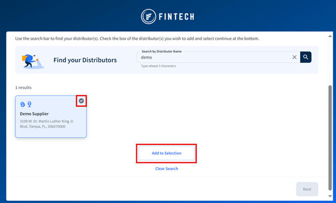 - In the Select Distributors screen, search for the vendor(s) you work for, select the vendor tile, then click the Add to Selection button. Repeat these steps for each vendor before clicking Next: