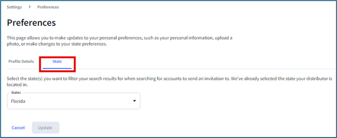 The State tab will affect what retailers you can see and send invites to. The default state will be dependent on where the vendor you’re logged into is located. When you add or remove states, the retailers seen within the Accounts tab will change based on where they are housed and whether you have that state added to your account.