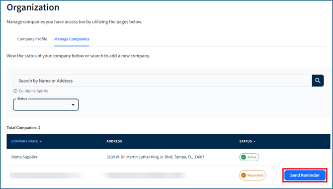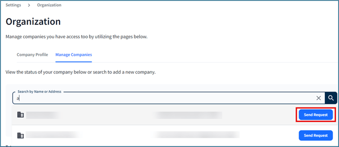Add other vendors to your account or view a company’s account status within Manage Companies. To add a new company to your account, use the search bar to populate it, then click the Send Request button: