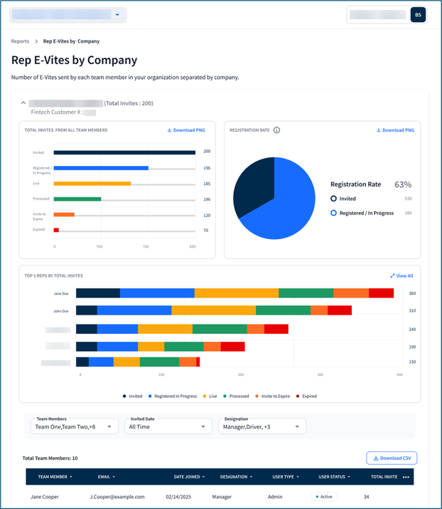 Analyze E-Vite activity per company, as well as by the associated team members.
